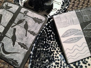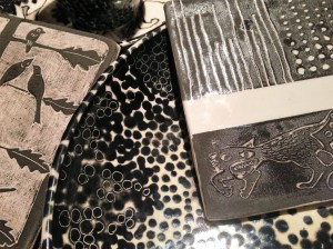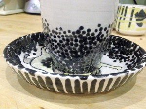 I’ve been working every week on little samples and experiments for people to have fun with in the pottery painting workshops at All You Read is Love. I just got a little into my own thing on the Scraffito theme ready for the Halloween evening on 27th October All mixed up – variants on the lucky donut, cat and other things I made earlier…