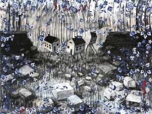 In a redeeming act of philanthropy, the Quakers were allowed to keep their land and building as they were using it for spiritual and community purposes. That history sparked thoughts about the drivers behind the land-grab; the need to provide shelter, build a home and raise a family – and just how precarious this endeavour can be.In the context of the forest, fairy-tales starring a set of anthropomorphised houses pitted against external, psychological and supernatural forces came to mind and I imagined a set of narratives that referenced current, historical and fictional happenings.